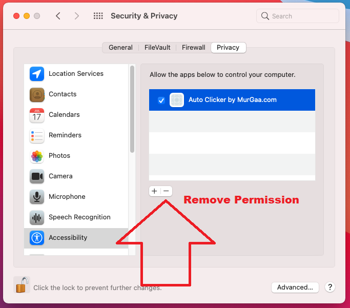 - Now in the Right Hand Side List of Applications, Select this Software and Click on Minus Button to Remove the Permission Provided.
